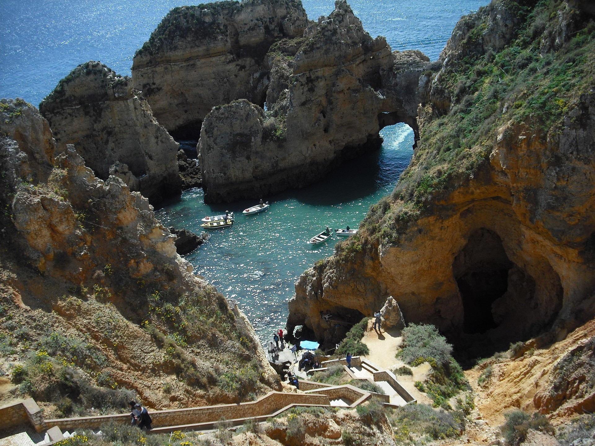 - The Benagil Wonder: Stand atop the cliffs to peer into the “Cathedral” of the sea—the Benagil Cave. Witness the sunlight streaming through its natural skylight onto the hidden beach below.